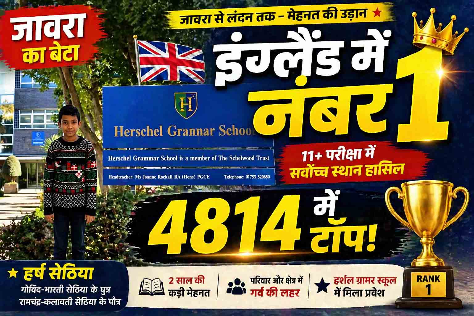 जावरा/लंदन। प्रतिभा किसी सीमाओं की मोहताज नहीं होती, इस बात को जावरा के हर्ष सेठिया ने सच साबित कर दिखाया है। इंग्लैंड में सेकेंडरी स्कूलों में प्रवेश के लिए आयोजित प्रतिष्ठित 11+ प्रतियोगी परीक्षा में हर्ष ने 4814 विद्यार्थियों के बीच सर्वोच्च स्थान प्राप्त कर एक बड़ी उपलब्धि हासिल की है।