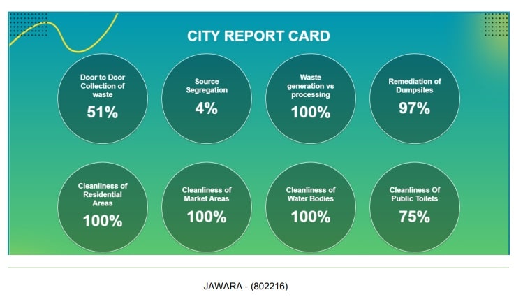 गुरुवार को जारी हुई स्वच्छता रैकिंग में जावरा शहर को एक लाख की आबादी वालों शहर की श्रेणी में शामिल 824 शहरों में से 129 वां स्थान मिला हैं। जबकि स्वच्छता सर्वेक्षण के तीनों फैज मिलाकर जावरा नगर पालिका को 10 हजार मे से 8001 नंबर मिले हैं। वहीं ओडीएफ और जीएफसी सर्टीफिकेशन में 2500 मे से 1000 अंक मिले। इस प्रकार स्वच्छता सर्वेक्षण और सर्टीफिकेशन के कुल 12500 अंक मे से 8742 अंक मिले हैं। इन अंकों के चलते जावरा शहर को नेशनल रैंक में 129 वां स्थान तथा स्टैट में 201 वां स्थान प्राप्त हुआ हैं।