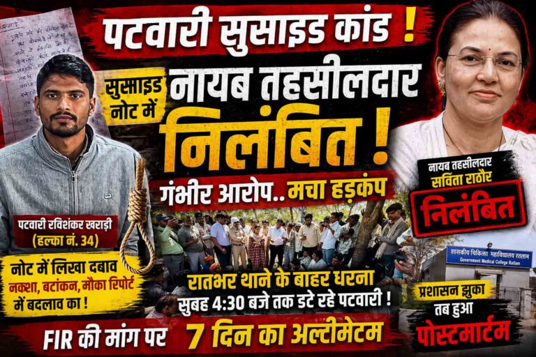 रतलाम। जिले की आलोट तहसील अंतर्गत पदस्थ पटवारी रविशंकर खराड़ी (हल्का क्रमांक 34) की 21 अप्रैल को हुई आत्महत्या के मामले में अब बड़ा प्रशासनिक एक्शन सामने आया है। जैसे ही घटना की जानकारी सामने आई, कलेक्टर मिशा सिंह ने मामले की गंभीरता को देखते हुए त्वरित कार्रवाई की। मृतक पटवारी द्वारा छोड़े गए सुसाइड नोट में नक्शा बटांकन, मौका रिपोर्ट, पंचनामा एवं बटांकन फर्द में बदलाव के लिए दबाव बनाए जाने का उल्लेख किया गया है। इन गंभीर आरोपों के आधार पर तत्कालीन नायब तहसीलदार आलोट सविता राठौर को संभागायुक्त आशीष सिंह की स्वीकृति से कलेक्टर द्वारा तत्काल प्रभाव से निलंबित कर दिया गया। निलंबन अवधि में उनका मुख्यालय अनुविभागीय अधिकारी (SDM) कार्यालय, रतलाम शहर निर्धारित किया गया है।